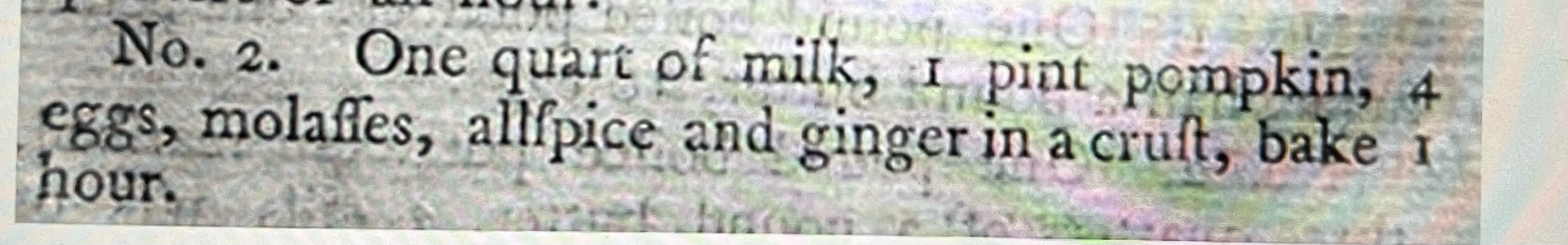 In the 18th century, colonists would have gotten their eggs from farm animals, as farming was a large part of their lifestyle. Colonists would either get eggs from their own farms or purchase eggs from other colonists(“Growing Food”). Colonists would either milk the cows they owned, or they would buy milk from other colonists(“Growing Food”). Colonists learned how to plant and eat pumpkins from Native Americans. The colonists began to plant pumpkins in their gardens, so pumpkins were very accessible. Before Simmons recipe, the colonists recipe consisted of cutting the tops off of the pumpkins and putting spices into the pumpkins (Newspapers,2009). Simmons recipe changed the game as she used the pumpkin’s insides for the pie’s filling and made a crust. This is still the way we make pumpkin pies today. Molasses was imported to the United States by the British. The colonists bought their molasses from merchants, and it was the most popular sweetener as it had a natural sweetness and was cheaper than sugar (“The Fascinating Connection between Rum and Molasses and the History”). Allspice and ginger were imported to the colonies from Britain. Colonists could make trades and buy these spices from merchants, so these spices were readily available to most middle-class colonists(Terrell,2017). Colonists had to make the pie crust themselves, and the ingredients were flour, water, and butter. The colonists grew grains such as wheat or rye and made their own flour. Colonists went to wells nearby and collected water. Women colonists specialized in butter churning, so colonists could churn their own butter or buy it from other colonists (“Why the Saying Should Be “as American as Pumpkin Pie,” Not Apple”). Colonists would then use Dutch ovens or cook over the hearth to bake the pumkin pie (Ken,2015). Pumpkin pies were mainly cooked around Thanksgiving, and based on most of the ingredients, it seems like mainly middle-class colonists would be able to cook this dessert. Overall Amelia Simmons recipe paved the way for the pumpkin pie we know and love today.
