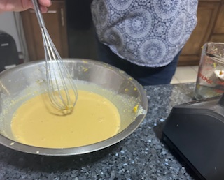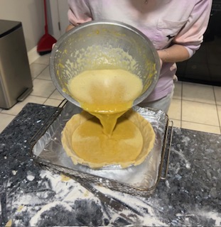 Next, I made the crust for the pie. I was not sure how to make a pie crust, so I went to the YouTube channel “Townsends,” which specializes in 18th-century recipes, and I used their recipe. I added 2 cups of flour in a bowl, 2 pinches of salt, and 6 cups of butter and mixed with my hands. I added 7 teaspoons of water to the mixture while I kept mixing with my hands. I added flour onto the counter, put the dough on the counter, and rolled out the dough with a rolling pin. I found it very difficult to get the dough smooth and fully rolled out. I put the crust into a tin mold, and added my pumpkin pie filling to the crust. I found out I made too much filling, as only one-half of the filling fit into the crust. I wanted to bake both pies at the same time, so I let this mixture sit while I made the mixture for the Libby 2023 recipe.