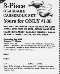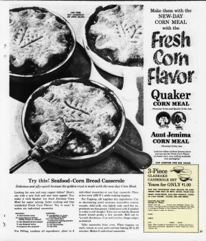 Many of the ingredients that are popular in the recipes are due to the women. “It is the religious duty of every housewife to accomplish the art of cooking.” (Hulse 5) Women were expected to master the art of cooking because it was the only thing society saw they could do “which pertains to the practical concerns of life, – a fact that is already recognized in the cases of boys.” (Hill and Boston Cooking School 335) So many women found casseroles to be a blessing because they could use a variety of ingredients they had on hand, throw them in a glass casserole, cover them, and put them in the oven to cook for hours. They could go on about their other housewife duties and not worry about making dinner for their family. (Hulse viii) “There was no time lost transferring to another dish as it is both cooked and served in the casserole” (Hulse vii) Which allowed them to fulfill their moral duty of being compassionate and hospitable to others.