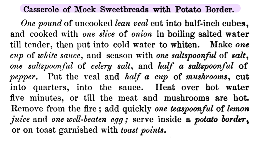 It is important to note that during this period, America was advancing in technology that allowed mass production of produce so items became more available through markets. So many core items in a casserole dish are inexpensive and readily available to all classes such as onions, butter, carrots, rice, etc. Fish was especially inexpensive because “of its abundance, cheapness, and wholesomeness…” (Lincoln 159) However, those who could afford other fulfilling meats were seen as “wealthier.” Specifically, veal was seen completely differently compared to fish. Veal was expensive even if it were out of season or poor cuts. (Lincoln 239) The sweetbreads of veal were considered a luxury item, a sign of wealth if you could afford to have the pleasure of eating it. Despite it being cooked in a casserole the same way as a fish casserole, it became a symbolic class distinction. There were recipes created that were meant for people who couldn’t afford veal to be able to enjoy. An example is seen below: