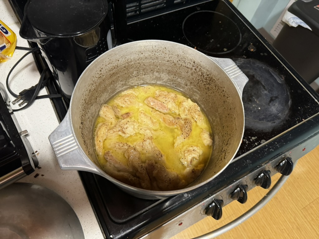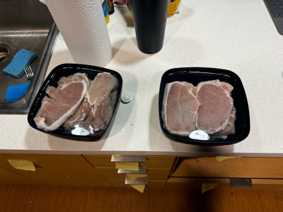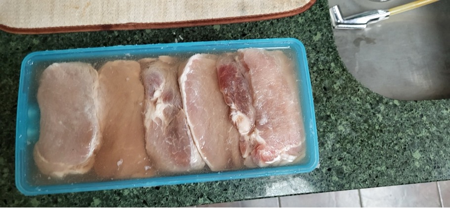 I started by getting a sealable container to put everything in and covering the bottom with salt. I then laid the porkchops I had bought on the salt and added a layer of salt on top of that and repeated this twice. I then started preparing the brine by boiling some water and adding salt until an egg would float. I then covered the container and stuck it in the refrigerator. I used the refrigerator to emulate doing the preservation in the winter and fall which is when it would actually be done. I then waited about a week and a half for it to cure and then began working on making my stew pie.