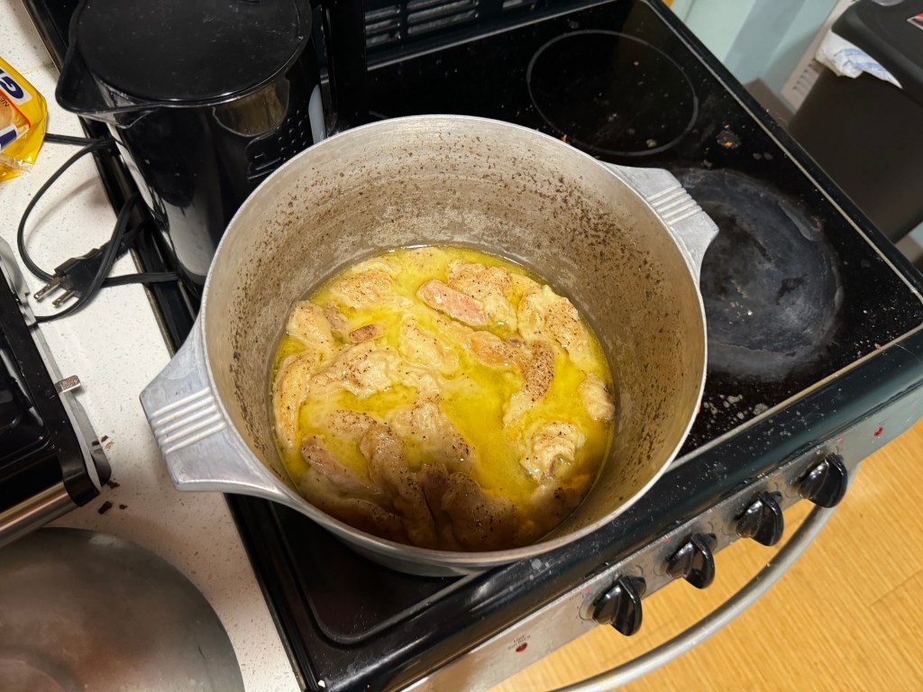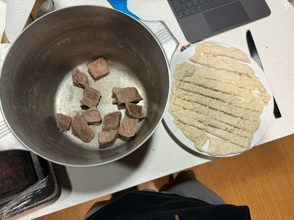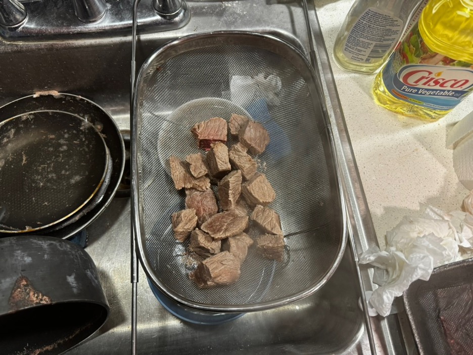 So I cut up my beef to make it cook faster (and also because I was worried that it wouldn’t fit in the pot I was cooking it in) and set it to boil. I then foolishly decided to eyeball boiling the beef while watching a movie leading to it boiling over and being a bit tougher than I intended. But we’re going say that was intentional and that I was emulating an 18th century mother having to cook dinner while nursing their child with pneumonia and or dysentery. After boiling the beef I separated it and stored the broth in some bowls