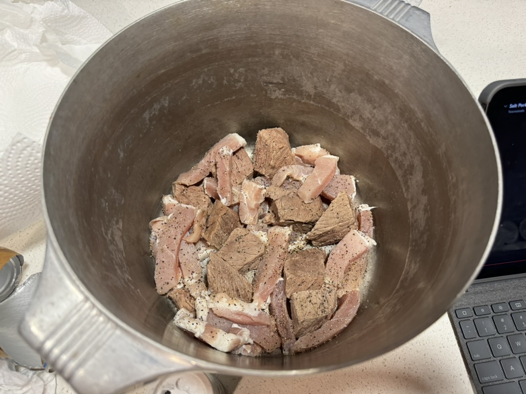 After this I began putting the meat in the pot. I put the beef in first then put strips of the salt pork, then unsalted butter, then seasoned with pepper. I then layer the biscuit dough on top of it all and added more pepper and foolishly: some salt.