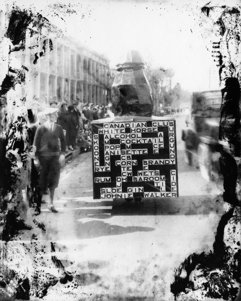 In January 1920, prohibition became the law of the land. Not so shockingly, the day came and went, with New Orleans liquor culture remaining mostly in-tact. Although quickly moved underground, alcohol remained pumping through the city’s veins. In the early days of prohibition, establishments selling alcohol invented codes to order drinks. A lunch room at Union and Carondelet had a code relating to the number of fingers shown to order strengths of liquor, and after the lunch rush would convert into a speakeasy3. Raids rarely faced these somewhat open sales of liquor. By the mid-20s, the attitude surrounding alcohol in New Orleans during prohibition went from not caring to really not caring about federal law. The now defunct coding system was so out in the public eye that jokes and satires regarding the enforcement of prohibition could be found during Mardi Gras. In 1925, the code system and federally published terms referring to alcohol appeared on a comical Mardi Gras float. The decanter shaped float features a crossword attached to the side, with intersecting terms of the time. The people photographed around the float are laughing, smiling, and yelling, contributing to the light-hearted feeling of the topic and the seriousness lacking from the discussion around prohibition in New Orleans.